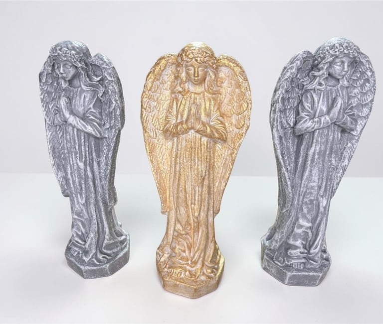 Angels are classic, serene figurines that add a sense of peace and spirituality to a garden or memorial. It typically features intricate details on the wings and flowing robes. They are available in many color combinations. Natural gray or white dry-brushed finish are very popular color combinations.